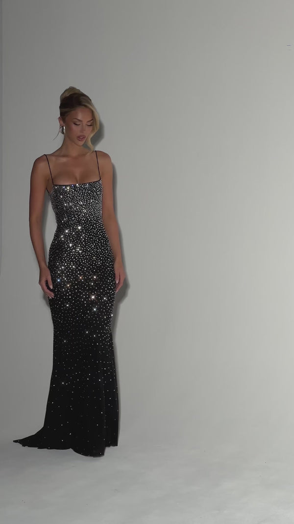 De zwarte Gaia- jurk is gemaakt van elastisch mesh, subtiel versierd met strass-steentjes in verschillende vormen, gerangschikt in een kleurverloop voor een stralend en verfijnd effect. De jurk heeft een elegante vierkante halslijn, dunne bandjes en een prachtige open rug, versterkt door plooien in het midden.